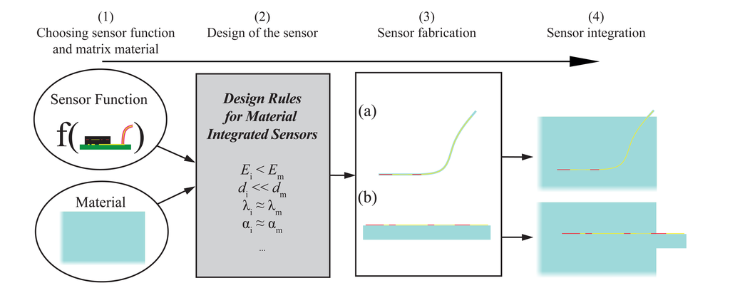 Thus, we see that integrating sensors in a material will only be possible when the design of the sensor is adapted to the integration process with the matrix. Consequently the sensors and the integration process have to be as minimally invasive as possible, to reduce the wound effect to dimensions of other material defects, like entrapped air or impurities.