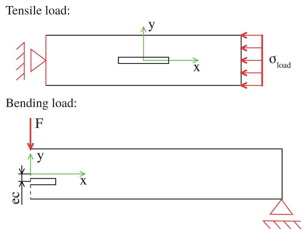 Since in the bending case there is symmetry to the y-axis, only half of the geometry has been modeled. All geometrical parameters were freely selected. In all simulations, we varied the geometrical parameters. All results are dimensionless and independent of the geometry.