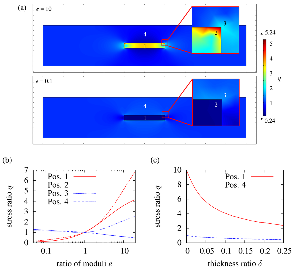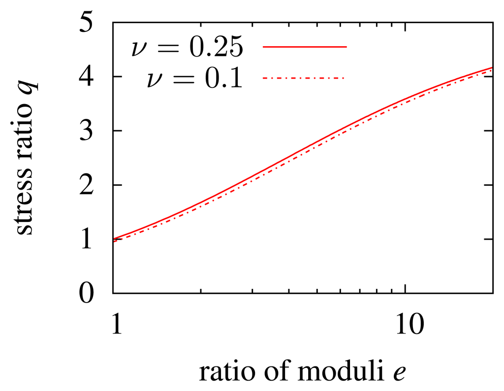 For the tensile load σref = σload and for the bending load, the reference stress σref is the von Mises stress at the outer edge of the matrix σouter edge. e (ratio of the moduli) was varied between 0.05 and 20. The Poisson ratio was set to 0.25. The basic geometric parameters of the composite are: