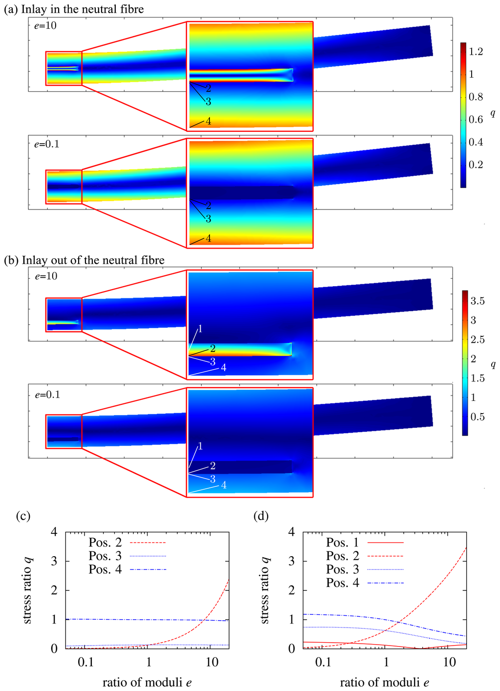 The results for an inlay in a neutral fiber are shown in Figure 5a,c. Position 1 is not considered, because it is a neutral fiber, and there is no mechanical load. If we first have a look at a hard inlay, the stress in it is not higher than at the outer edge of the matrix up to e = 8. The load at the matrix/inlay interface (Position 4) is low, too. Thus, we can state that an inlay integrated with the neutral fiber can be harder than the matrix up to a certain limit, while it does not downgrade the overall structural behavior. If the inlay is soft, there is nearly no influence. Although the inlay is like a hole in the matrix, it does not downgrade the structure, because it is placed in a neutral fiber, where there is minor mechanical stress. In contrast to this, if an inlay is placed outside the neutral fiber, the influence increases, which is shown in Figure 5b,d. Due to the “hole”, the stress at the outer edges increases by about 20% (q = 1.2) with e = 0.1. If the inlay is hard with respect to the matrix, the stress at the matrix/inlay interface is much higher than that at the outer edge of the matrix (compare Position 2 and Position 4). The inlay is much more rigid than the inlay, but the elongation of the composite is dominated by the matrix. The hard inlay has the same bending radius the matrix has, while the moment of inertia of the inlay is much higher than that of the matrix. Thus, high stress is generated at the inlay/matrix interface. If the inlay fractures, then there is crack growth, which leads to the failure of the whole composite. One example is a needle in silicone. If the silicone is bent, the needle will not follow the movement of the silicone. The needle will cut through the silicone. Another example is a ceramic in plastics. While the ceramic is much more rigid than the plastic, there is a high risk of cracks in the ceramic. A final conclusion can be made for both types of inlay (hard and soft): sharp edges should be avoided, because there is a high risk of cracks and crack propagation.