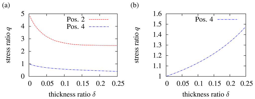 To focus on the influence of the inlay thickness in the case of bending, the thickness parameter δ is again used (see Equation (13)). The variation of the inlay thickness in the neutral fiber is not considered. While the neutral fiber has no mechanical load, the load on very thin inlays in the neutral fiber is negligible. This is of course totally different from inlays outside the neutral fiber. Figure 6a shows the variation of δ between zero and 0.25 for e = 10. If we take a look at the matrix/inlay interface according to Position 2 in Figure 5, the mechanical load increases, while the inlay thickness decreases. A thin and hard inlay does not take a high load in comparison to a thick and hard inlay. Consequently, the mechanical load at the outer edge of the matrix increases, which is seen by the blue dashed line. Of course q = 1 is not exceeded, because for δ → 0, the inlay thickness becomes zero, and thus, it is equal to a non-existent inlay. Figure 6b shows the variation of δ for a soft inlay (e = 0.1) at the outer edge of the matrix (in accordance with Position 2 in Figure 5b. Here, it becomes again clear that the inlay is like a hole in the matrix. The thicker the inlay (δ increases), the higher is the load at the outer edge of the matrix, because the moment of inertia decreases, while the bending load stays constant.