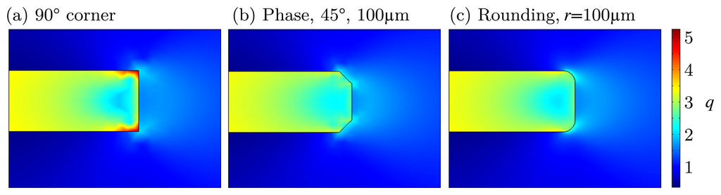In some cases, it might not be possible to adapt the inlay to the matrix to reduce mechanical stress caused by a tensile load, for example. The reason for this can be process compatibility, like thermal treatment or less chemical resistance during fabrication. As derived from Figure 3, high stress is generated at the inlay/matrix interface, especially at the edges. While rounding or phasing the edges, the maximum stress is reduced, which can be seen in Figure 7. The basis for this is the standard geometry (see Figure 2). With a 45° phase or a rounding, the maximal load qmax is reduced to less than 3.5 (in comparison: 90° edge q = 5). The results in Section 2.1 have shown that the load in the inlay is q = 3.5. Thus, we can state that, due to rounding or phasing of the edges, the highest load is not at the edge anymore, but at the center of the inlay.