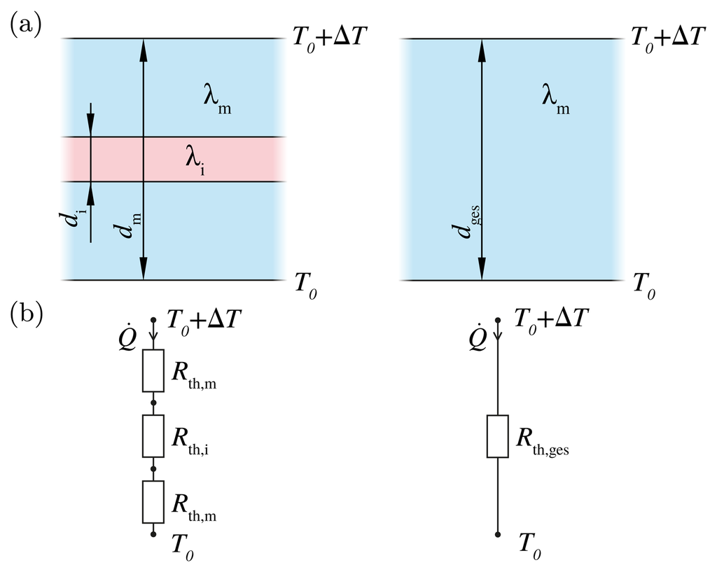 Let us assume that the area of the inlay and matrix are equal and that we have a one-dimensional problem. Then, the structure can be replaced by an equivalent circuit. The thermal resistance Rth is the thickness d divided by the product of the cross-section A and the material-dependent thermal conductivity λ: