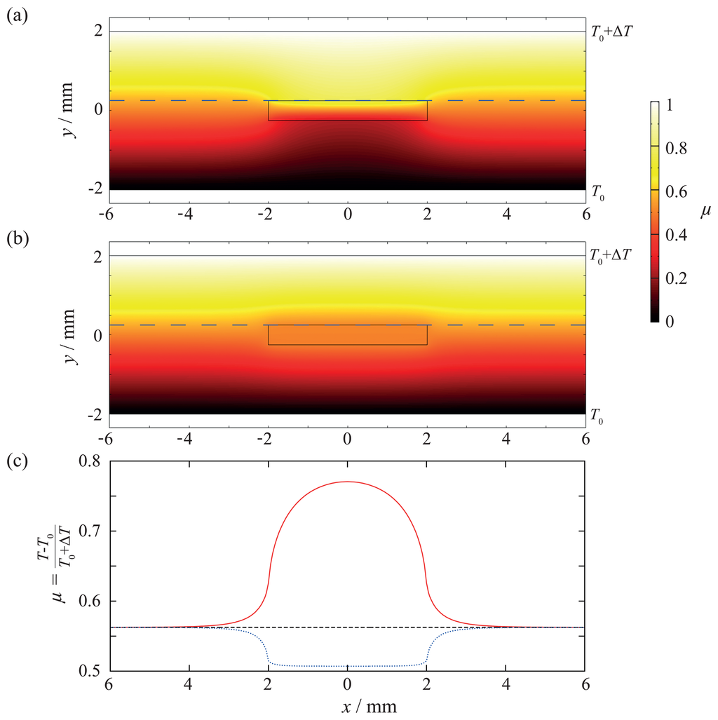 Figure 9a shows the result for a ten-times lower (λi = 0.1 λm) thermal conductivity of the inlay. The temperature factor μ along the x-axis above the inlay is shown in Figure 9c. A thermal impact due to the inlay can be clearly seen. Due to the lower thermal conductivity, a hot spot is created. Without the inlay, the temperature coefficient above the inlay would be μ = 0.56, but with inlay, it increases to μ = 0.77. This has three consequences: First, overheating can lead to failure of the matrix, because the maximal working temperature is exceeded. Second, a sensor that is sensitive to temperature is measuring the hot spot temperature, but not the real temperature. Third, this can lead to thermally-induced mechanical stress if there is a mismatch in the thermal coefficients of expansion of the inlay and matrix, which might be the reason for mechanical failure (see also Section 3). The results for an inlay with a ten-times higher thermal conductivity (λi = 10λm) are shown in Figure 9b,c. In this case, instead of a hot spot, a heat bridge is created. Overheating cannot occur, but a sensor that is sensitive to temperature will not measure the right temperature. Additionally, in case there is a mismatch in the thermal coefficients of expansion, thermally-induced mechanical stress will occur, as well. Therefore, it can be determined that a lower or higher thermal conductivity of the inlay can lead to different failures.