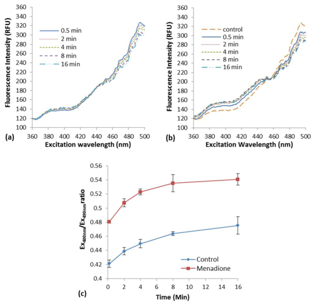 The induction of oxidative stress in E. coli roGFP2 cells with the exposure to menadione in liquid suspension was examined. An increment in excitation spectrum peak at 400 nm and a decrement at 490 nm was observed after menadione exposure (Figure 1b) as compared with the modest response of biosensor in rest (Figure 1a). An apparent rapid increase of fluorescence excited with 400-nm excitation by exposure to 1 mg·L−1 menadione was observed, in an opposite fashion with the excitation by 490 nm (Figure 1b). This was a typical oxidation response of roGFP2-expressing E. coli cells [3].