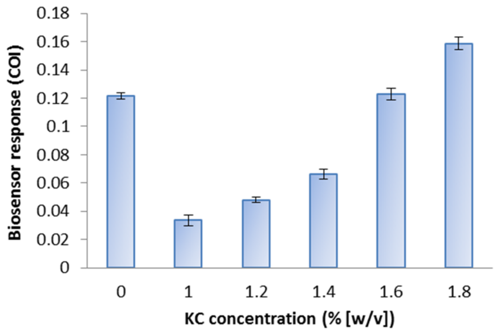 The highest COI against 1 mg·L−1 menadione exposure was obtained at 1.8% (w/v) KC (Figure 2). In 1.0% to 1.4% (w/v) KC gel, the COI was lower than suspended cells in the buffer (0% KC). Increasing sensitivity was observed for biosensor prepared in increasing KC concentration. Higher concentrations (greater than or equal to 2% w/v) of KC were not suitable for a practical use at the temperature that keeps E. coli cells vital, due to the very rapid gelation.