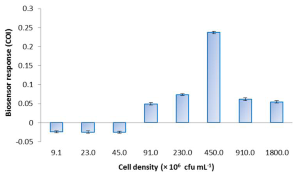 E. coli roGFP2 oxidative stress biosensor was prepared with different cell densities and challenged with 1 mg·L−1 menadione to determine the optimal density for the biosensor response (Figure 3). COI increased following the increase in cell density from 4.5 × 106 to 4.5 × 108 cfu·mL−1. A maximal response was observed at 4.5 × 108 cfu·mL−1. Cell densities exceeding the optimum (810 and 1800 × 106 cfu·mL−1) resulted in decreased COI.