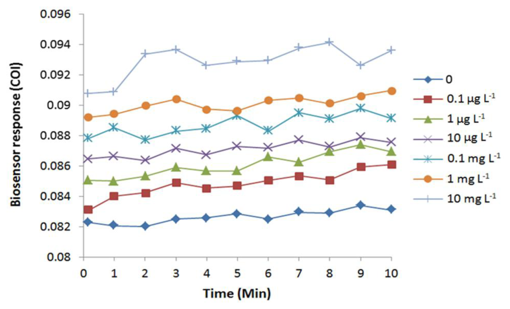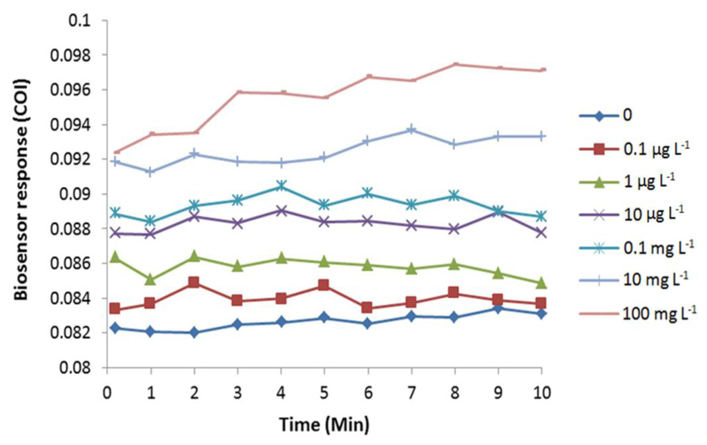 Selenite induced increase of COI in a time dependent manner, suggesting E. coli cells were oxidized by the selenite exposure (Figure 6). Similar to the response to arsenite, cellular oxidation occurred immediately after the exposure (faster or equal to 10 s). Response achieved full cellular oxidation to selenite exposure at 8 min, except for 0.1 mg·L−1. The oxidation response was apparently dose-dependent. Linear response was observed from 10 ng·L−1 to 100 mg·L−1 (Figure 7), showing a very wide dynamic range. LOD was determined as low as 5.8 ng·L−1.