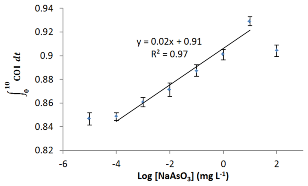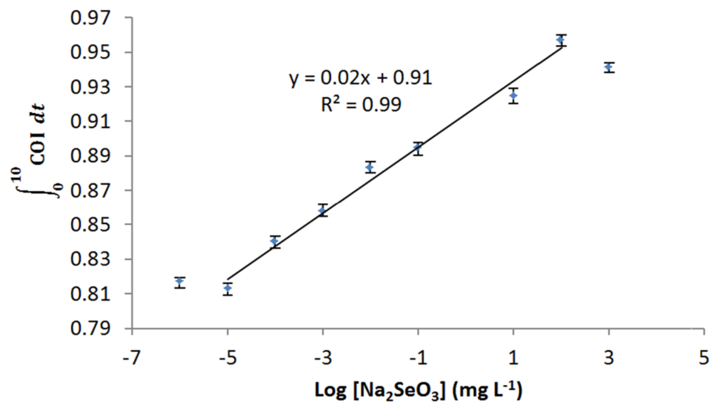 The E. coli roGFP2 oxidative stress biosensor was exposed to two metalloid compounds: sodium arsenite (NaAsO3) and sodium selenite (Na2SeO3). COI was recorded as mentioned in Section 2.3.2. Both chemicals were prepared with 10−1 dilution each level starting from 100 mg·L−1 to 0.1 μg·L−1. The dose-response relationship and limit of detection (LOD) for both metalloids were determined.
