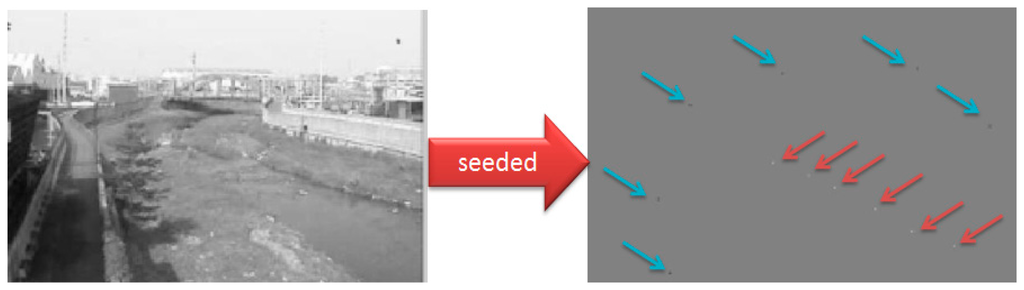 Figure 2. Example of seed point setup. The figure on the left shows the originally observed image, and the figure on the right shows the set positions of seed points, including both the river water part in the foreground and the surrounding environment (i.e., embankment and the sky) in the background. The seed points include two sections: The water region (indicated by red arrows) and the background section to be removed (indicated by the blue arrows).
