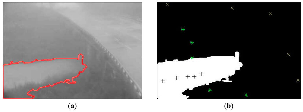 Flood risk detection and warning are included in the image-processing module to detect the risk level of the flood region and determine whether a warning should be generated on the basis of the risk level. Assuming that the flood is an invasion object and the entire field of view is the our surveillance view, the overlap proportion of the detected overflow region and the preset warning points are used as the standards of risk estimation. For example, if there are five preset warning points and four of them are invaded, or included in the overflow region, then the risk is 80%. Figure 3 shows a real example of the IFA system detecting a floodwater region. Figure 3a shows the detected water region, which is indicated by the red boundary; in Figure 3b, the white area represents the identified water region, the foreground seed points are represented by black plus signs (+), background seed points are represented by yellow “x” signs, and the user preset warning points are represented by green asterisk symbols (*). The flood risk detection and the warning thresholds are calculated as follows: