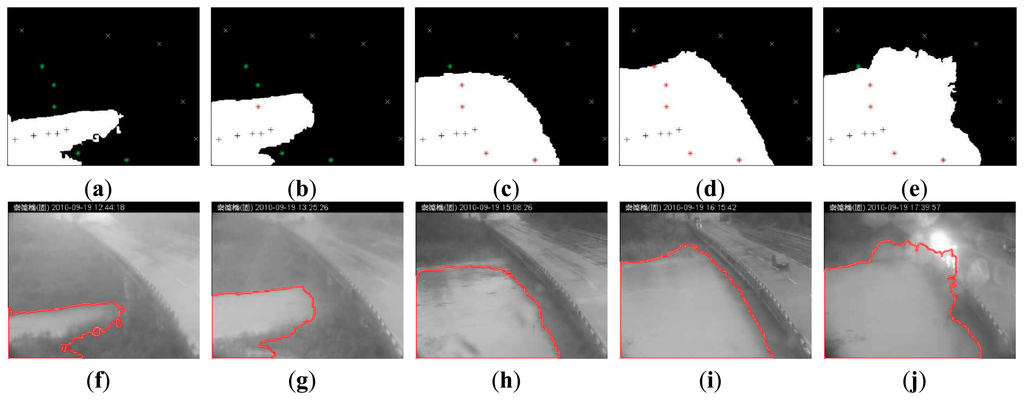 Figure 5. Test results of a real-life case. Figures (a) to (e) show the foreground seed points (+), the background seed points (x), and the preset warning points in green (*) marks in the processed binary images. In these binary images, the white segments indicate the detected water area, while the black segments show the background objects (e.g., ground, the sky, and bridge) to be deleted. Figures (f) to (j) show the flooding area detected from the input video, indicated by the red boundary.