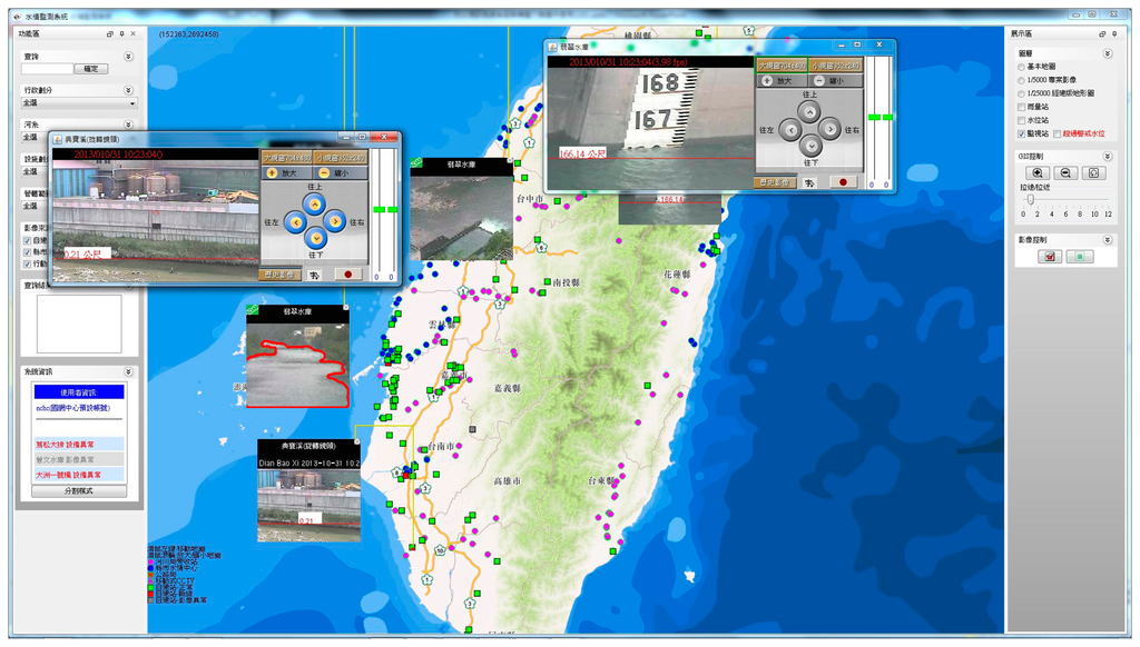 With the automated image processing method, a large number of remote surveillance videos at various locations can be simultaneously monitored for a flood warning service. This can be combined with river monitoring images and city traffic surveillance images to perform large-scale near real-time flood detection and obtain information about the overflow area. Warnings are subsequently sent to the relevant staff on duty and online disaster prevention monitoring systems if the risk levels of the rivers or the other sections are higher than the threshold values. An automated, quick, and easy flood warning service can be provided to replace the manned monitoring. Figure 6 shows a combination of the proposed image processing system and the existing flood monitoring screen. Locations with high-risk levels automatically show up on the flood monitoring platform. Surveillance videos and identified flood events at high-risk locations automatically pop up on the interface or get circulated to specific staff in other ways.