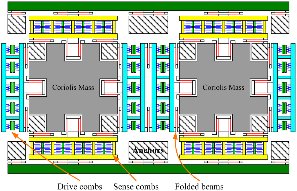 The tuning fork micro-gyroscope operating at atmospheric pressure has large proof masses to increase the signal noise ratio of the Coriolis response and has a large drive force to increase the vibration amplitude in the viscous air. The simplified schematic of the tuning fork micro-gyroscope with mechanically coupled drive mode and sense mode is shown in Figure 1 [18]. The sense combs are configured as squeeze mode to improve the sensitivity. The proof mass, or the Coriolis mass, is the central mass in the structure which transfers the vibration energy from the drive mode to the sense mode through Coriolis Effect. As illustrated in Figure 1, the micro-gyroscope has two identical proof masses whose working vibration directions are always opposite. This is why this kind of micro-gyroscope is named as tuning fork gyroscope. This configuration produces a differential signal and rejects acceleration from the environment, which is common-mode to the structure.