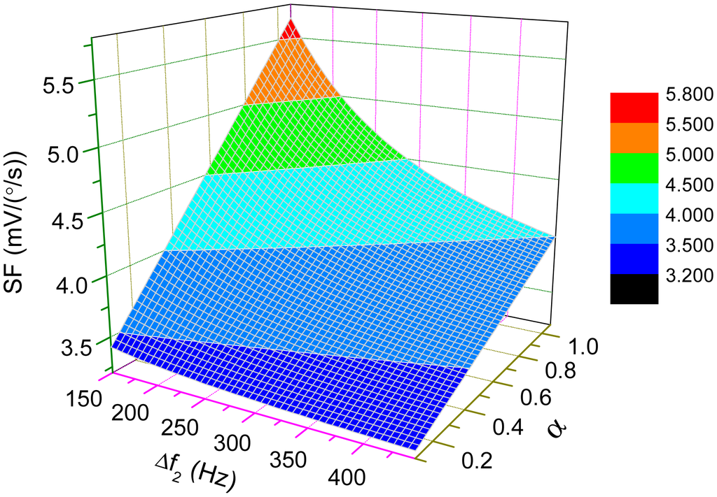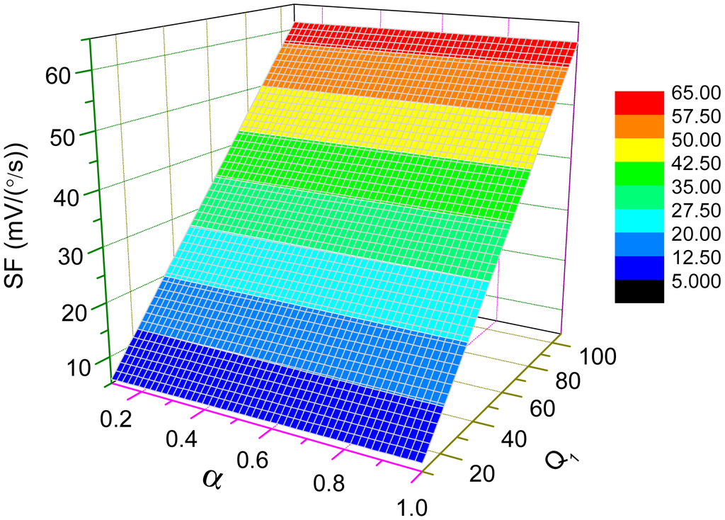 Figure 10 illustrates the dependence of the scale-factor on Q-factor and α under this mode-matched condition. From the plot in Figure 10, the scale-factor is nearly proportional to Q which may achieve more than thousands in vacuum packaged micro-gyroscopes. The sensitivity of those micro-gyroscopes can be greatly improved under the mode-matched condition.