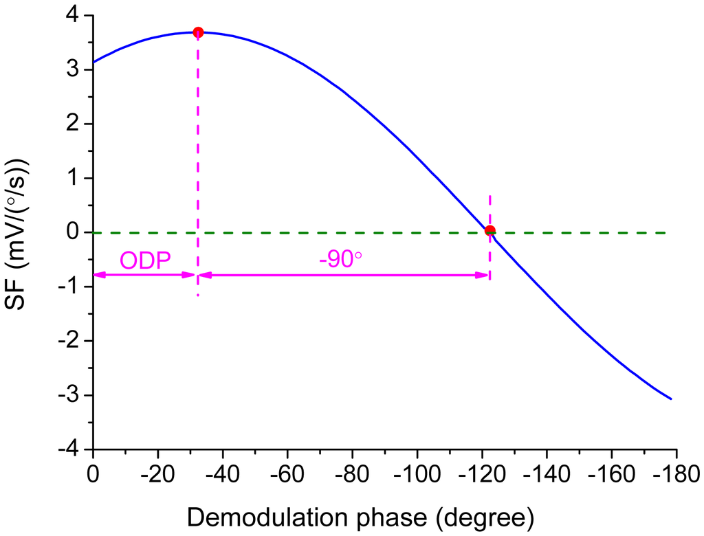In practice, the demodulation phase can hardly be exactly the same with the ODP. The variation of the scale-factor is shown in Figure 11 when the error of the demodulation phase, φ − φod, is introduced by varying φ from 0° to −180° in Equation (20). The scale-factor reaches the maximum value when the demodulation phase is set as the ODP determined by Equation (4) while the scale-factor becomes zero when the demodulation phase is delayed another 90°. This implies that the reference signal is orthogonal to the Coriolis response. The slope of the curve in Figure 11 at the ODP point is zero while the slope becomes the steepest at the point where the scale-factor reaches zero. This relationship can be used in experiments to find out the exact ODP.