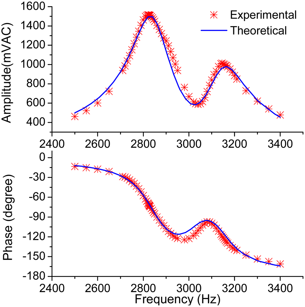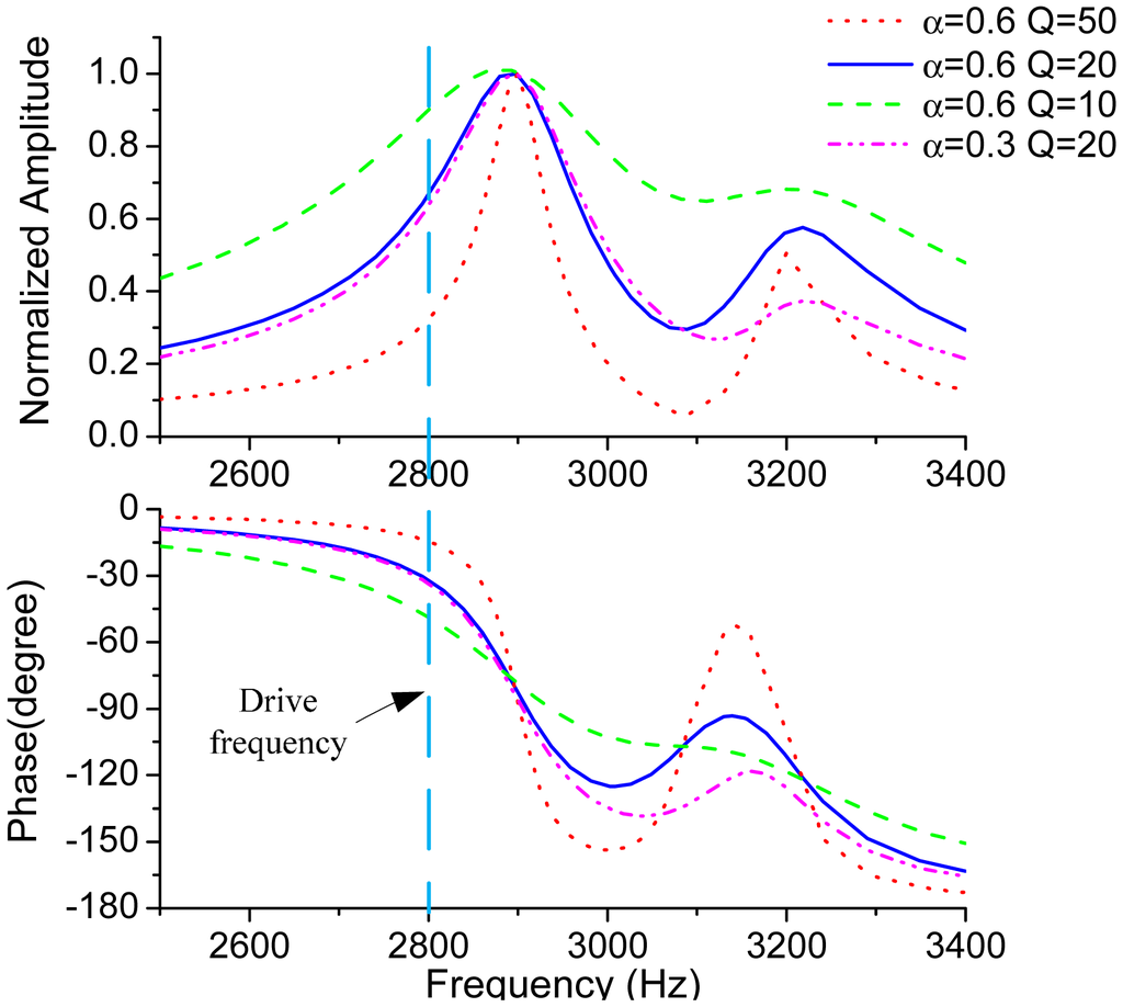 Figure 3 plots the frequency responses of the sense mode by using Equation (2) with the parameters of fny1 = 2900 Hz, fny2 = 3200 Hz,Q1 = Q2 = Q. The parameter values used in the simulations are close to those of the tested micro-gyroscope. For the sake of clarity, the amplitudes of the primary peaks are normalized to 1. It can be concluded from the frequency responses that the amplitude and phase get steeper as Q-factor gets larger. The amplitude of the secondary peak is also determined by the coefficient α.