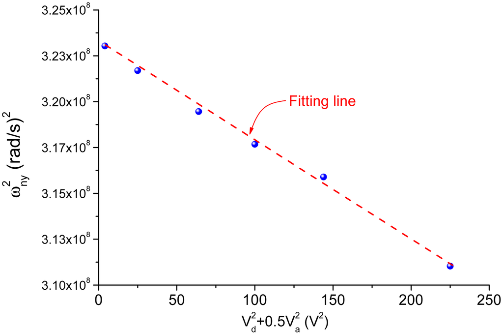 As mentioned before, the sense combs are configured as squeeze mode which has an effect of negative electrostatic stiffness. When a voltage is applied to the electrodes, the stiffness of the sense mode will decrease in accordance with the following equation