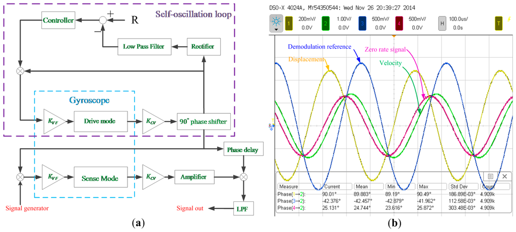 The frequency response of the micro-gyroscope was measured by using virtual rate table method which is described in [21] in detail. Figure 15a illustrates the block diagram of the control and sense circuits for the experiment. The phase delay block, which was implemented with an all-pass filter, was set as about −42.5° while the theoretical ODP is calculated as −43.7° by using the parameters listed in Table 1.