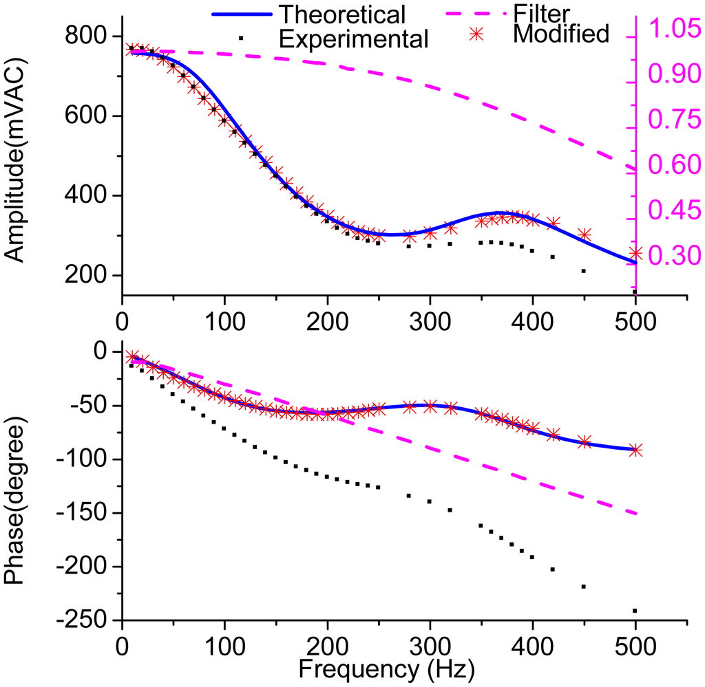Figure 16 shows the measured frequency response of micro-gyroscope and the theoretical response calculated from Equation (16) by using the parameters listed in Table 1. In order to filter the harmonics introduced by the demodulation, the LPF at the output stage is necessary in the experiment. However, in the theoretical analysis, an ideal LPF is introduced. Considering the influence of the LPF, the amplitude attenuation and phase delay introduced by the LPF were also measured and are plotted with the pink dash line in Figure 16. Then, the measured amplitude response of the gyroscope was divided by the attenuation factor and the measured phase response was added with the phase delay. The modified data are plotted with red stars in Figure 16. In addition, to plot the theoretical curve, the negative electrostatic stiffness was considered and the total gain was adjusted as 3.4 × 1010 to fit the experimental data.