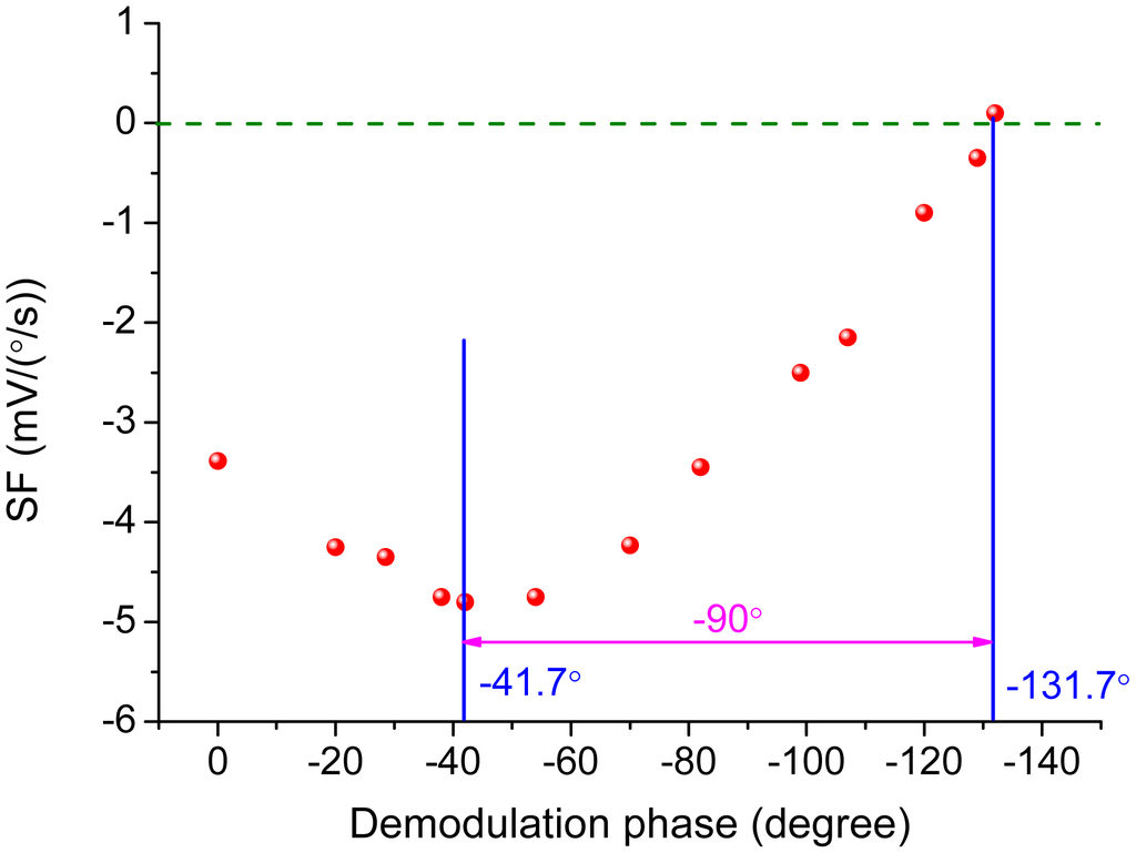 The change of the scale-factor with the variation of demodulation phase was measured by real rate table and is demonstrated in Figure 17. The demodulation phase was adjusted by the RC parameters in the all-pass filter. The scale-factor achieved the maximum value as −4.8 mV/(°/s) at the demodulation phase of −41.7° and decreased to zero at the demodulation phase of −131.7°. The ODP was obtained as −41.7° from Figure 17 and was in close agreement with the theoretical value calculated as −43.7°.