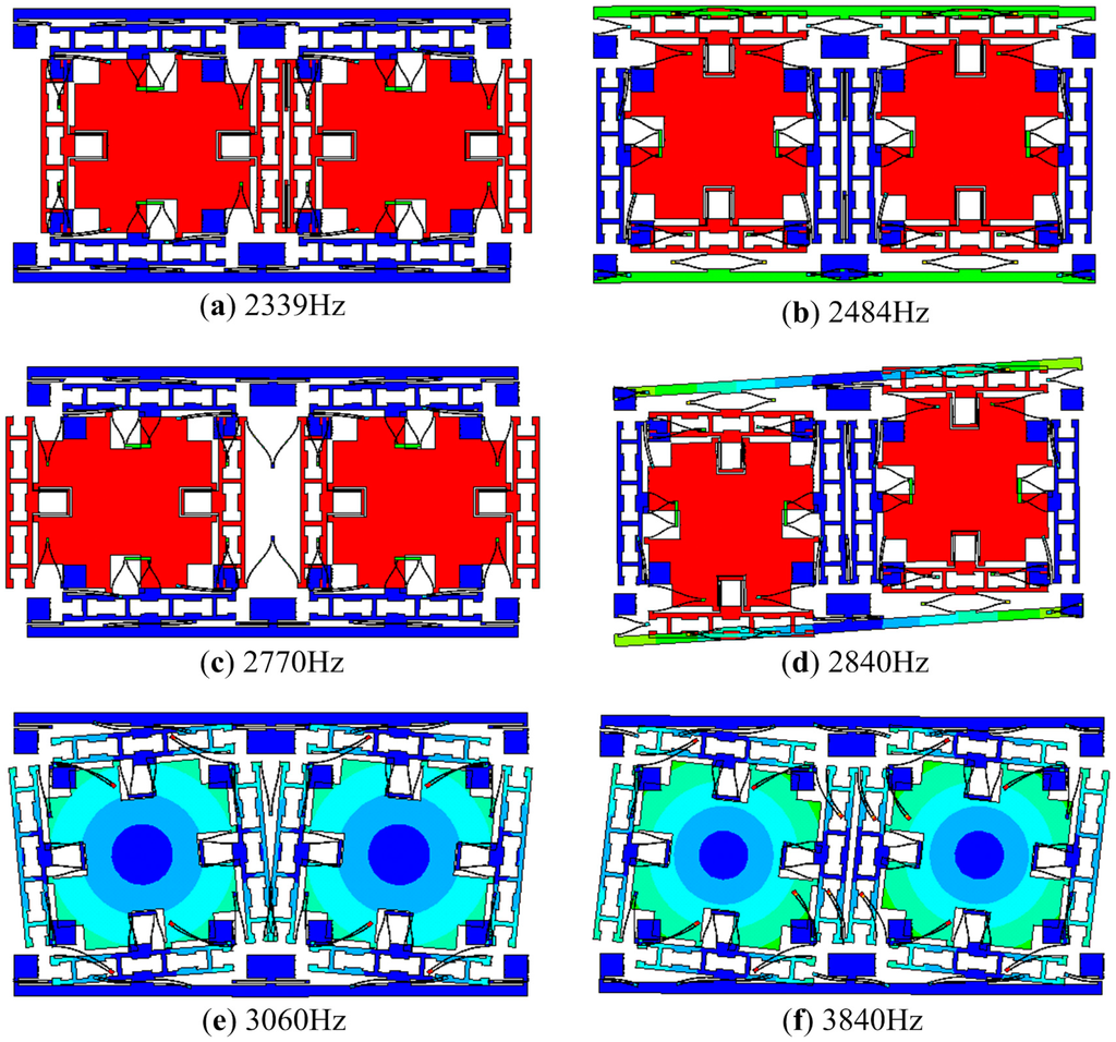 Moreover, once the interference modes appear, besides the angular rate applied to the sensitive axis of the micro-gyroscope, other motions, such as linear acceleration, vibration and rotation with respect to other axes, will cause responses in the sense direction. Linear acceleration or vibration along the sense direction will excite the in-phase mode in the sense direction. Under ideal conditions, this motion will not be detected thanks to the symmetric structure and the differential detection. However, under non-ideal conditions, this in-phase interference mode may be obviously observed in the sense direction. Hence, linear acceleration or vibration may cause a detectable response. Similarly, the out of plane modes, although not shown in Figure 2, will result in couplings from rotations applied to the non-sensitive axes.