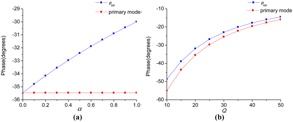 Figure 4 exhibits the relationships between the ODP, the Q-factor and the coefficient α. The red curve denoted as “primary mode” in Figure 4 is the phase delay introduced by the primary mode only. As illustrated in Figure 4a, the ODP is dominantly determined by the primary mode and appreciably decreased by the interference mode. In Figure 4b, as Q becomes smaller, the ODP gets larger, as well as the impact of the interference mode. In fact, although not shown here, the ODP gets within −1° when Q reaches hundreds to thousands, which is the general case in vacuum packaged micro-gyroscopes. Thus, the demodulation phase is always set as 0° in the high-Q micro-gyroscopes for convenience. However, the phase delay in the micro-gyroscopes operating at atmospheric pressure is significant and must be dealt with carefully.
