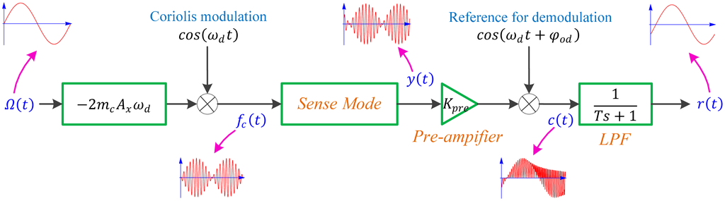 In most nonlinear systems, superposition theorem no longer can be applied, but benefiting from modulation and demodulation realized through multiplication, the primary mode and the interference mode can be considered separately. Furthermore, the reference signal for demodulation, cos(ωdt + φod), can be decomposed into cosφod · cos(ωdt) − sinφod · sin(ωdt). For clarity, the reference signal in Figure 5 is replaced with cos(ωdt) and the two modes in the sense mode are unified as:
