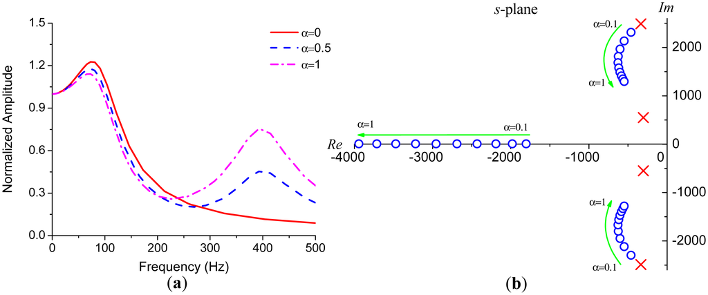 Considering the complexity of the fourth-order system described in Equation (16), numerical simulations are more straightforward than analytical methods in evaluating the frequency response of the gyroscope. Figure 6a demonstrates several frequency responses with different α. The parameters used in these simulations are the same with those in Figure 4a except Q1 = Q2 = 30. The primary resonance peak is weakened by the existence of the interference mode. This effect derives from the fact that the primary pair of zeros of Equation (16) gets closer to the primary poles as α gets larger, as illustrated in Figure 6b where the blue circles indicate the zeros and the red crosses indicate the poles.