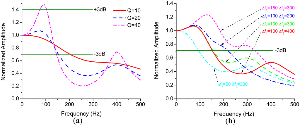 From Equation (18), the flatness of the frequency response can be fast evaluated. The primary resonance peak will appear if , or equivalently,