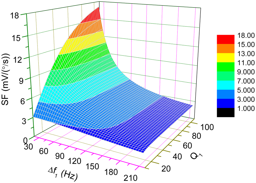 Interestingly, back to Figure 9 for low-Q cases, the scale-factor will not increase drastically as Δω1 approaches to zero. Even under mode-matched condition, the scale-factor is limited by low Q-factor. As mentioned in the last section, the open-loop bandwidth of the micro-gyroscope is dominantly determined by Δω1. So, the improvement of the sensitivity by decreasing the bandwidth is no longer obvious.