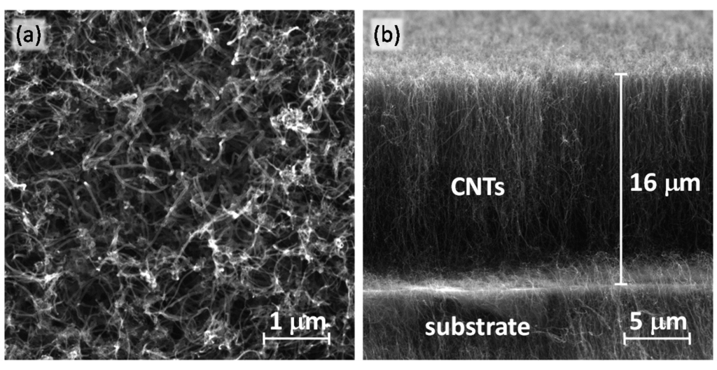 A fast growth of VA-MWCNT films on the c-Si and c-Si/SiO2 substrates has been achieved in MW plasma torch operated at atmospheric pressure without an external heating source [44,45]. The characterization of the VA-MWCNT films by SEM, transmission electron microscopy (TEM), Raman spectroscopy and the influence of process parameters on the CNT growth were discussed in detail in our previous publications [3,46,47]. Typical SEM images of prepared VA-MWCNT film are shown in Figure 2. Although the cross-sectional view in Figure 2b confirms the vertical alignment of the CNT film, the top view (Figure 2a) reveals that the alignment at the end of nanotubes is not perfect. The CNTs having a high aspect ratio, less than 80 nm in the diameter and a length of about 16 μm, are curled at the top end due to different heights. Therefore, top view micrographs cannot provide sufficient information about the structure of all the CNT film.