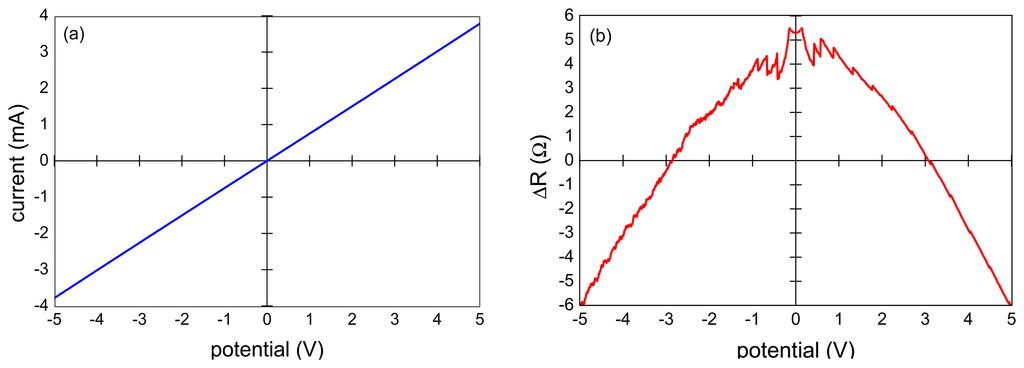 The measured I-V characteristics of the VA-MWCNT samples were nearly linear as documented in Figure 3a for the sample shown in Figure 2. The resistance was in the range of 1–1.3 kΩ. The specific electrical resistance was about 0.5 Ω·cm as calculated from Van der Pauw measurement and the film thickness of 16 μm determined by SEM. A small nonlinearity was revealed when the difference of the sample resistance and its linear approximation was plotted (Figure 3b). The deviation from linear behavior was governed by an exponential growth with a small exponent. The nonlinearity of the CNT resistance did not exceed 6 Ω which corresponded to 0.5% of the film resistance.