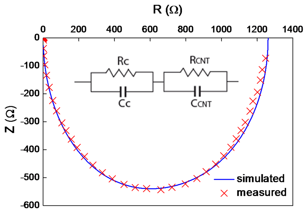 Fitting of the impedance measurements confirmed a simple RC model of two resistances and capacitances in parallel (Figure 4). According to Plombon et al. [10], the contact pads added a significant part of the RC circuit element. The RC/CC circuit represents the contact impedance, and RCNT/CCNT stands for the impedance of the vertically aligned CNT film. The resistances of the contact and the CNT films were 500 and 700 Ω, respectively. The capacitance of the contacts was much higher, about 15 nF, than the capacitance of the CNT film, 3.5 nF. It means that the surface of nanotubes is not pure enough to create a good contact. Adsorbed molecules such as water, CO2 and O2 can create a dielectric film that contributes to its high capacitance.