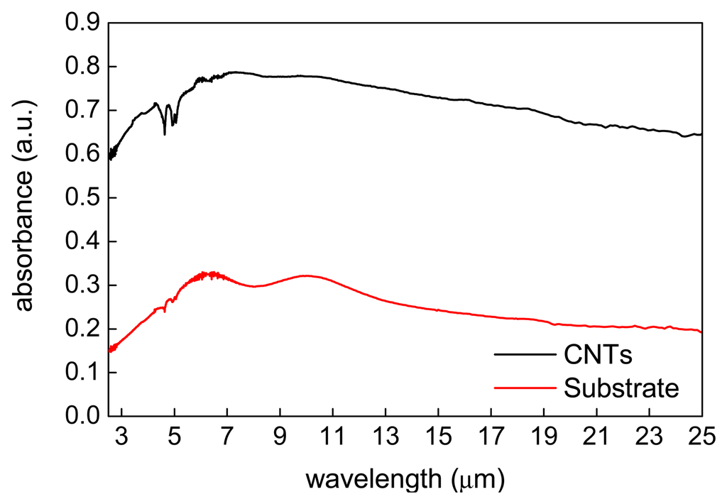 The IR absorption of VA-CNTs on the Si substrate covered by 300 nm thick SiO2 film was investigated with the Fourier transform infrared (FTIR) spectrometer Nicolet iS50 in the attenuated total reflection (ATR) mode. The ATR crystal was pressed against the sample and the measurement was performed in the wavelength range 2.5–22.5 μm. The absorbance of the VA-CNT sample was compared to the absorbance of Si substrate covered by 300 nm thick SiO2 film and 5 nm thick Fe film used as catalyst of the CNT growth.