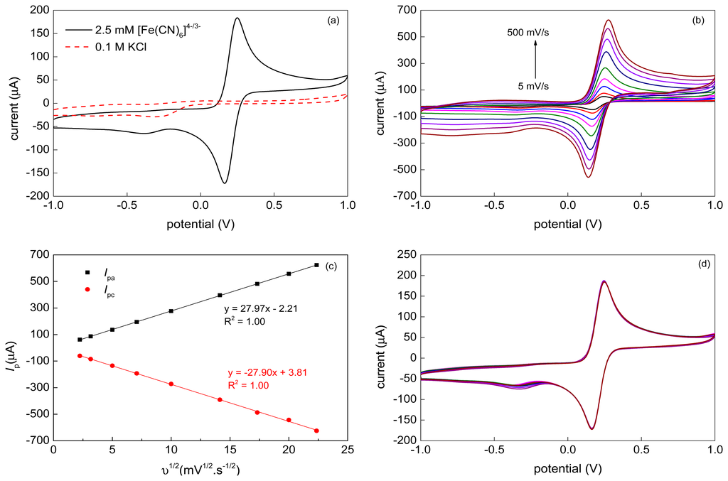 A representative cyclic voltammogram recorded at 50 mV·s−1 with the VA-MWCNT electrode and 2.5 mM [Fe(CN)6]4−/3− (1:1) solution in 0.1 M KCl is shown in Figure 6a. Two well-defined symmetric redox peaks separated by ΔEp = (Epa − Epc) = 83 mV were observed. The ratio of the anodic and cathodic peak currents reached unity (Ipa/Ipc = 1.01). The results indicated that the VA-MWCNT electrode promote electron transfer quite well.