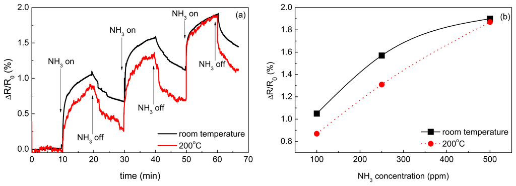 According to the data presented in Figure 7b, the sensor exhibited higher response to NH3 at the room temperature than at 200 °C. Since the adsorption is an exothermal process, it is enhanced with the decreasing temperature. The response ΔR/R0 ranged from 0.87% to 1.9%. The dependence of the sensor response ΔR/R0 determined after 10 min of the exposure on the concentration of NH3 was almost linear at 200 °C whereas the relation became strongly nonlinear at room temperature. It can be linked to an incomplete desorption of NH3 at room temperature.