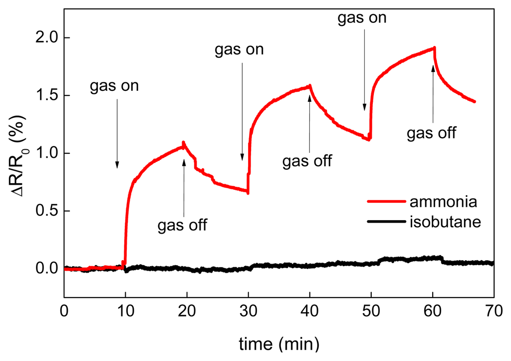 The results of the CNT sensor response to NH3 at room temperatures and 200 °C are shown in Figure 7a. Since the sensor resistance increased during ammonia exposure, it is concluded that free carriers—the holes—in MWCNTs were neutralized by electrons coming from adsorbed NH3 and, therefore, MWCNTs exhibited p-type nature. This phenomenon has been already described in previous studies. Hoa et al. supposed that MWCNT is a p-type semiconductor and the adsorption of electron donor compound such as NH3 decreases the charge carrier concentration, thus inducing an increase of the resistance [54]. The same mechanism of interaction of adsorbed electron-donor compound with p-type CNTs was also described in [34,55–57]. The main interaction mechanism of ammonia with CNTs is a reversible adsorption. Vikramaditya et al. assume that NH3 is physisorbed on non-doped CNTs [58]. Thus, the sensing mechanism of ammonia with CNTs consists of two main steps, (i) physical adsorption of gas molecules and (ii) a charge transfer between adsorbed molecules and CNTs [59,60]. Testing of the sensor sensitivity to isobutane was carried out at room temperature (Figure 8) and revealed that the sensor is insensitive to a non‐polar molecule such as iC4H10.