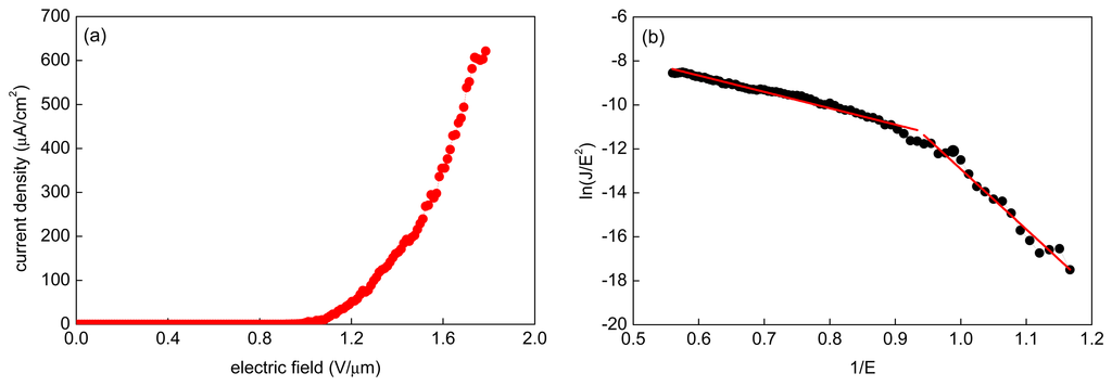 The measurements of field emission current were carried out multiple times at 10 emitter-to-anode distances from 84 μm to120 μm. The current density in dependence on the electric field intensity calculated from measured results is shown in Figure 9a and the corresponding Fowler-Nordheim (F-N) plot is in Figure 9b. Straight lines in the F-N plot indicates the quantum mechanical tunneling characteristic of the electron field emission and are based on the F-N equation