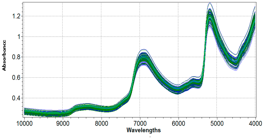 NIR spectroscopy is a secondary or correlative technique, i.e., the spectral data collected are correlated through statistical means to some reference (laboratory) data. It is a type of vibrational spectroscopy in the wavelengths range of 4000–10,000 cm−1. The spectral occurrence in the NIR region are dominated by overtones and combination bands, characterized by weak and overlapped absorptions. Although such spectra are more difficult to interpret according to conventional techniques, a remarkable amount of information can be extracted by employing chemometric techniques [37]. They have been used in order to build regression models, which are subsequently developed as prediction tools [38].