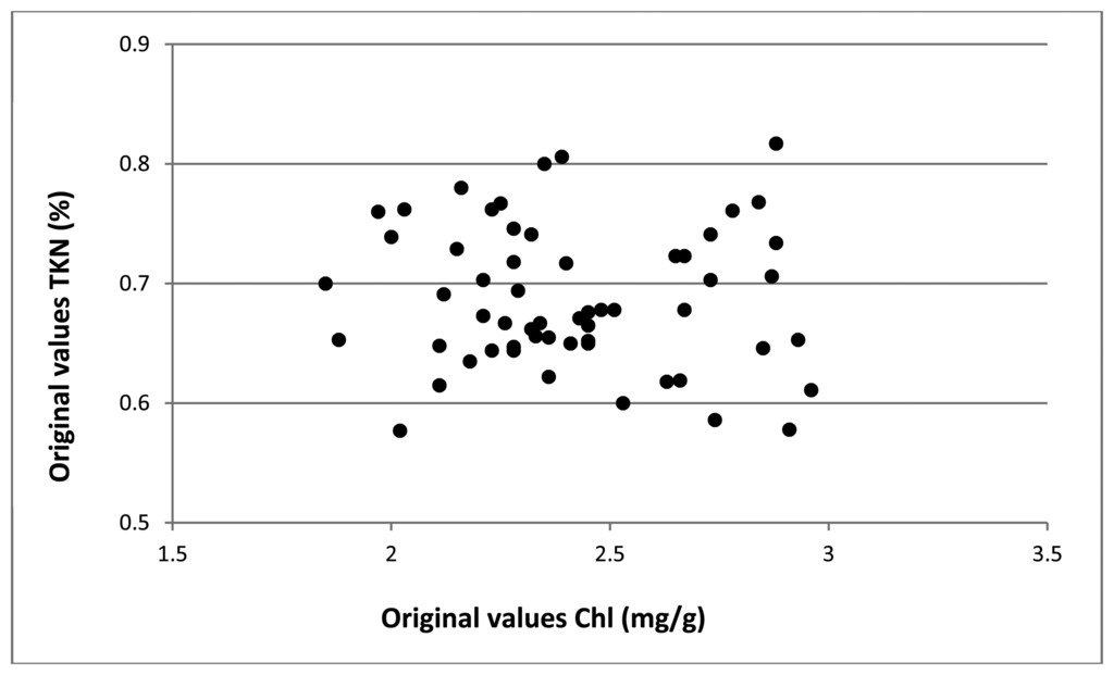 As previously mentioned, as much as 60%–75% of the TKN in a plant is located within the photosynthetic apparatus; for that reason, chlorophyll concentration can be exploited as an indirect estimation of plant N status [54]. Nevertheless, the effectiveness and reliability of this approach have been questioned [55], owing to the fact that the relationship between chlorophyll and N-content depends on growing conditions, seasonal trends, specific leaf features, nutritional status of the plant and so on. R2 values between 0.3 and 0.8 can be found in literature [56] for the correlation between the N-content and the foliar reflectance in the visible; moreover, the correlation dramatically falls at high values of chlorophyll. It is also worth recalling that, in our case, data on wet TKN and chlorophyll contents have shown an undeniable lack of reciprocal linear correlation (Figure 4), thus validating the weakness of the above linearity assumption.
