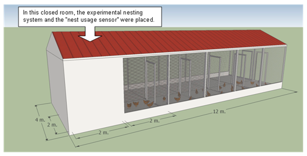 The experimental nesting system was installed in a separate building of a commercial laying farm, located in Lombardy (a region in Northern Italy), in which ISA (Institut de Sélection Animale) brown laying hens were reared. The building dimensions were 4 m × 12 m, comprised of two closed rooms, each 2 m × 2 m in size. To the right of each room, the building contained five covered cages of 2 m × 2 m. A part of the building was used for the experiment involving a total floor space of 8 m2. It included a closed room and a covered cage, adjacent to the room (Figures 2 and 3), that provided 0.4 m2 of floor space per hen and appropriate perches.