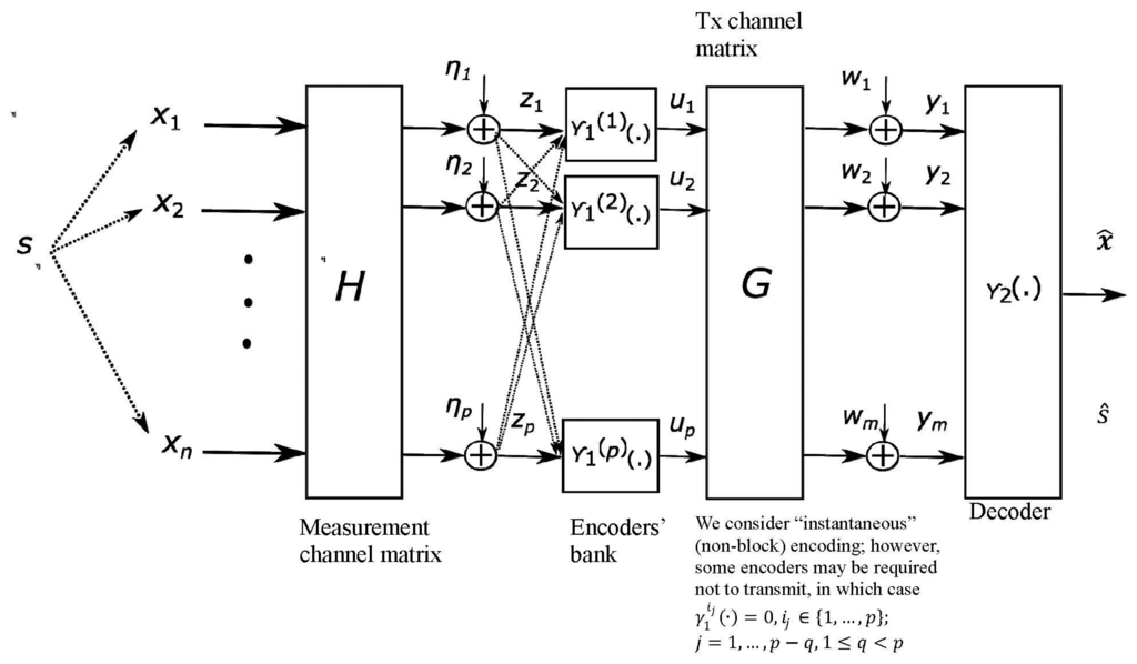 We consider only “instantaneous” (“single-letter”) coding, whereby the coding functions—generally nonlinear—at the sensors are applied to a single measurement individually for a single channel use, rather than to a block of measurements collected over time. The reason for this is essentially to limit the complexity of the code and the ensuing processing burden at the sensors. However, the dashed lines toward the encoders in Figure 1 indicate possible communication among sensors to exchange their measurements, with the arguments of encoding functions , changing accordingly. This yields the possibility to consider different encoding strategies, from completely decentralized (no measurement exchange) to fully centralized ones. The latter case corresponds to the centralized encoding of a Gaussian vector source over a Gaussian vector channel, a problem solved long ago in the linear case (i.e., when the encoder is constrained to be linear) in [61,62]. It is worth noting that the linearly constrained solutions, in the presence of an overall power constraint as in Equation (5), imply that some variables might not be transmitted (from the application of Karush-Kuhn-Tucker optimality conditions to the choice of the optimal coding matrix A), and hence give rise to q ≤ p encoders.