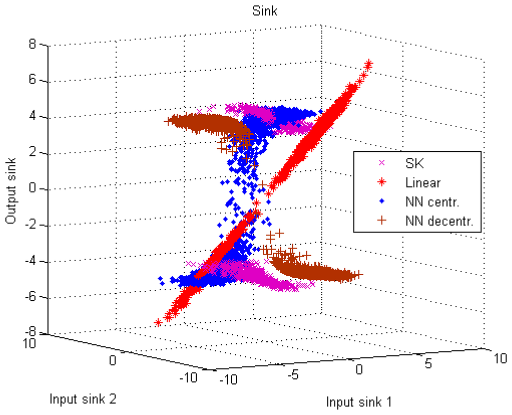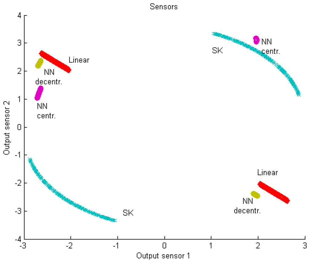 Some additional remarks may be useful to clarify the basic differences between the two nonlinear strategies. The SK coding is centralized, since the projection operation onto the spirals needs the joint knowledge of the two sensors' inputs. The NN coding process may work in two ways. In the centralized approach, each sensor i knows the input vector x of all the sensors. In the decentralized one, it knows only its own input xi as evidenced in Equation (27). SK defines coding functions in polar coordinates, while NN defines coding functions in Cartesian coordinates. SK has limitations in the number of coding components, i.e., p = 2, 3; an insightful discussion on how a further generalization may be tricky is presented in section V of [106]. The NN may be scalable to any p; the most severe limitations to scalability reside in the complexity of the minimization process in terms of (offline) computational effort, in the choice of an appropriate setting of the several parameters affecting the numerical process, and in the presence of local minima.