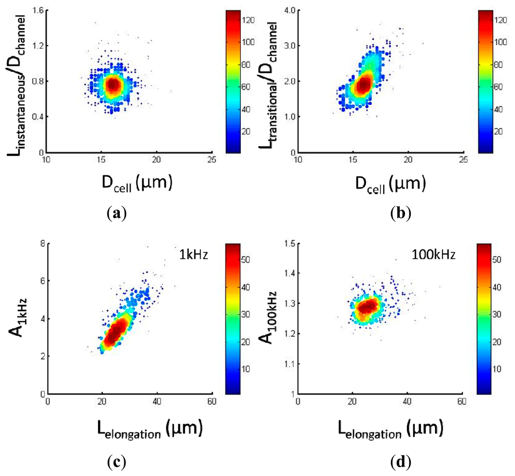 Figure 4c,d show scatter plots of cellular electrical data of A1 kHz vs. Lcell elongation (c) and A100 kHz vs. Lcell elongation (d), respectively, for 95C cells (n = 354). Quantified A1 kHz and A100 kHz were 3.92 ± 1.09 and 1.29 ± 0.04 where Lcell elongation represents the cellular elongation length during its travelling process within the constriction channel as an indicator of cell sizes. Compared to A1 kHz, A100 kHz was significantly lower since electric lines at 100 kHz effectively penetrate the cellular membrane portions while electric lines at 1 kHz always travel around capacitive cellular membrane portions. With the increase in Lcell elongation, a corresponding increase in A1 kHz was observed, further confirming the assumption that electric lines at 1 kHz pass around cells rather than penetrate cellular membrane portions.