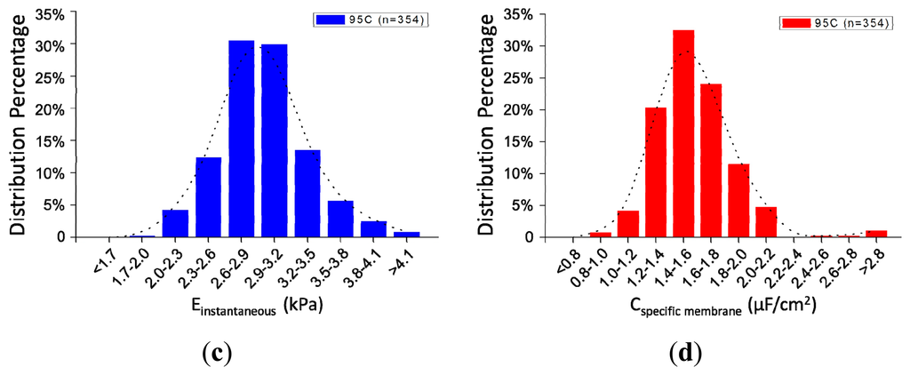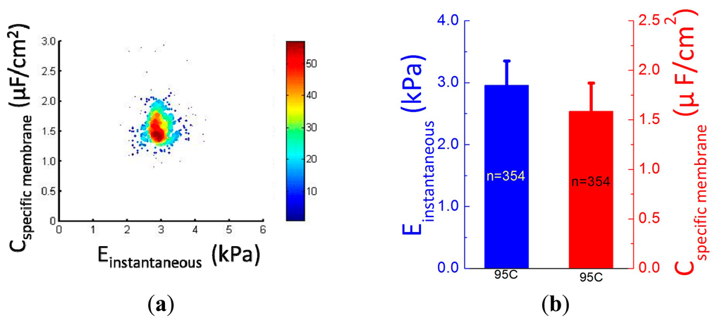 Figure 5a shows the scatter plot of Cspecific membrane vs. Einstantaneous, which were quantified as 2.96 ± 0.40 kPa (Einstantaneous) vs. 1.59 ± 0.28 μF/cm2 (Cspecific membrane) for 95C cells (n = 354) (see Figure 5b). Figure 5c,d shows distribution percentages of Einstantaneous and Cspecific membrane for 95C cells with the peak of Einstantaneous within the range of 2.6–2.9 kPa and Cspecific membrane within the range of 1.4–1.6 μF/cm2. These reported values were consistent with previously reported values [12,14], confirming that the proposed microfluidic platform is capable of characterizing cellular intrinsic mechanical and electrical markers simultaneously.