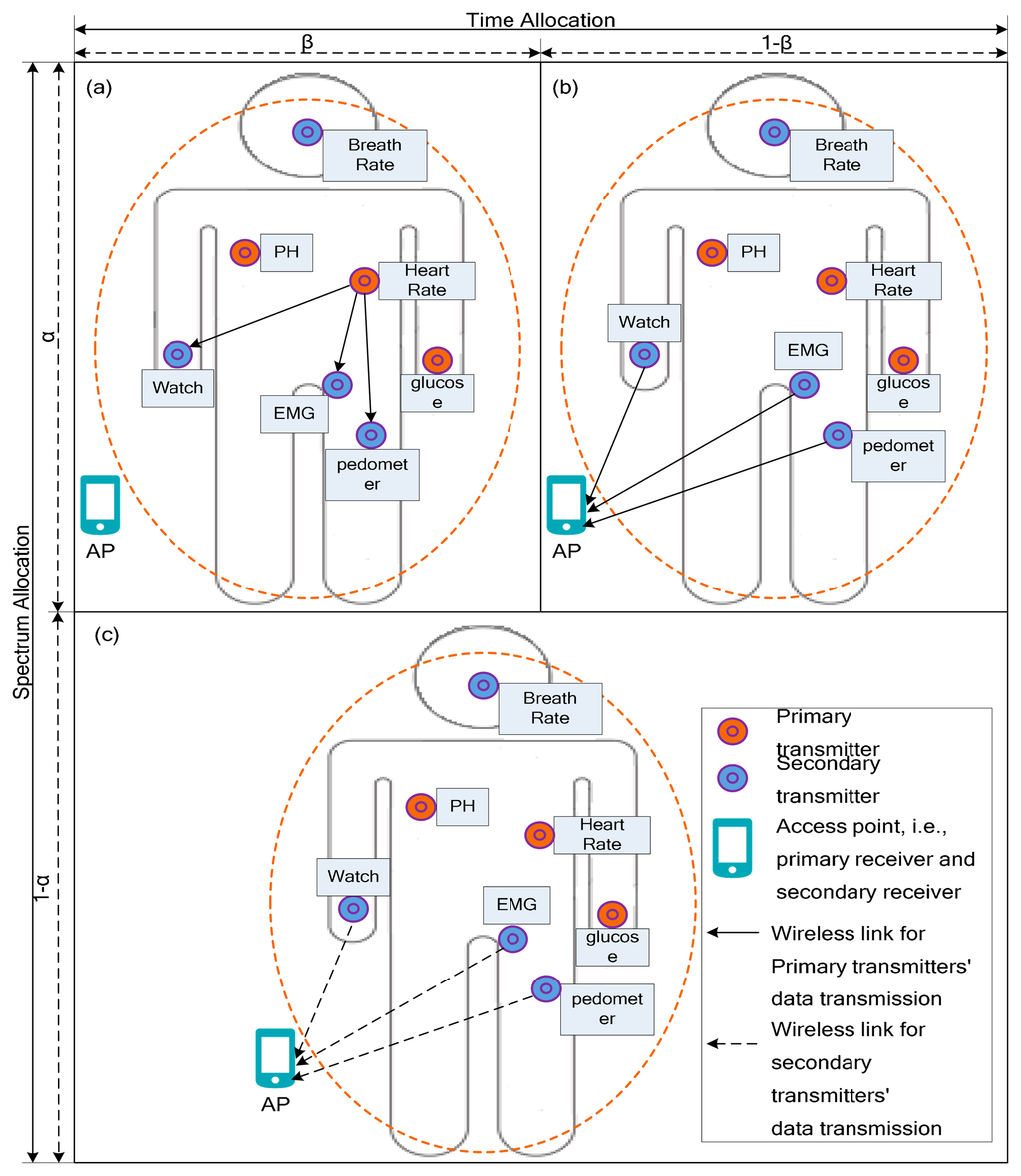 The system is presented in Figure 1, where there are several primary transmitters (PT), the implant sensor nodes, i.e., PH sensor, heart rate sensor and glucose sensor. The PT communicates with the primary receiver (PR) using the licensed spectrum. The system also has K secondary transmitters (ST) and a secondary receiver (SR), which are wearable nodes using the ISM spectrum, but they can sense the licensed spectrum for implant nodes and use it when the licensed spectrum is idle.
