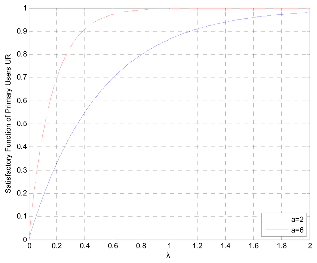 The mathematical relationship between the satisfactory function of primary users and the achieved rates versus their requirement rates ratio, λ, is shown in Figure 2. The satisfaction function increases with λ and gets close to the transmission requirement. The increasing rate will slow down when λ becomes bigger. For a larger a, the satisfaction function of the primary user will increase faster.