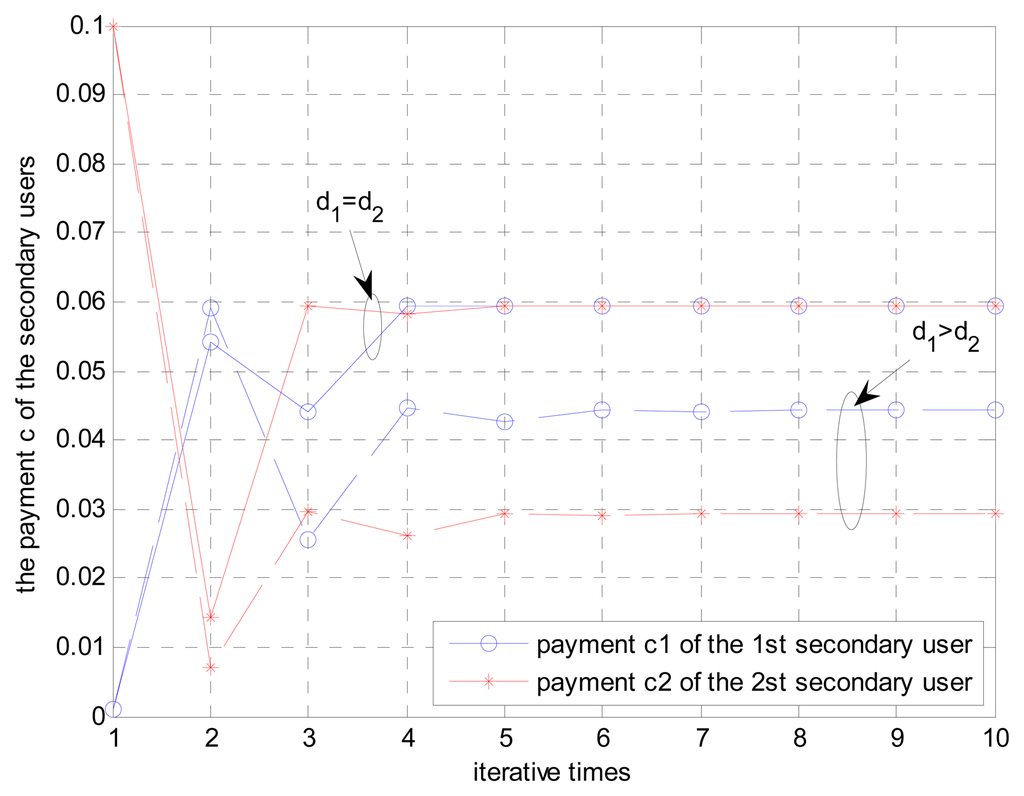 Firstly, the relay power of secondary users is verified. As shown in Figure 3, different channel state information of secondary users leads to different convergences where secondary users take for k = 2. In Figure 3, the selected two symmetrical secondary users have the same distance d from the primary user but different distances from the primary user, respectively. It shows that the convergence to the NE occurs after five iterations of both conditions, although the channel state information and payment weighing factors are different. Thus the convergences of two secondary users are different with five iterations.