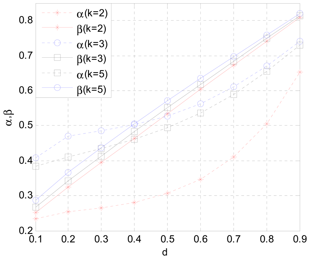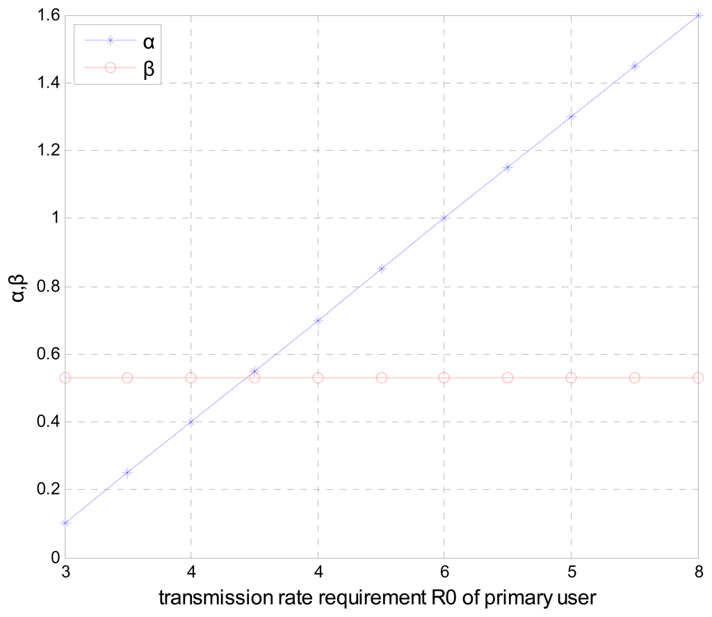 Figure 5 shows the primary user"s optimal strategy α* and β* with user's transmission rate (the normalized distance d = 0.3, and the number of the secondary relays k = 5). When the primary user's transmission rate R0 is increased, the bandwidth strategy parameter α* goes up linearly, since the larger R0 requires more time spent on transmission of the primary user's data. While the optimal bandwidth strategy β* remains independent of the transmission rate requirement R0 and stays constant, this simulation result also complies with the analyzed result given in Section 3.